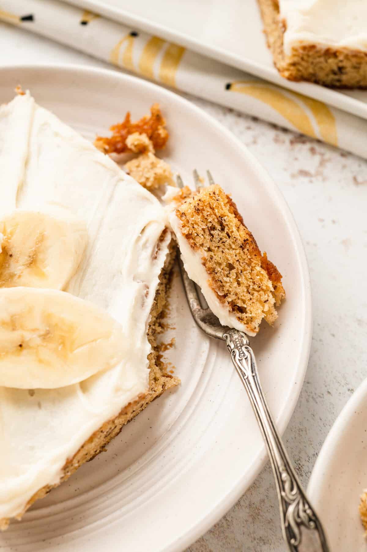 To make the frosting, cream the butter and cream cheese in a bowl. Gradually add the powdered sugar and vanilla and beat well to combine. Spread the frosting over the cooled banana bars. Slice and serve!
